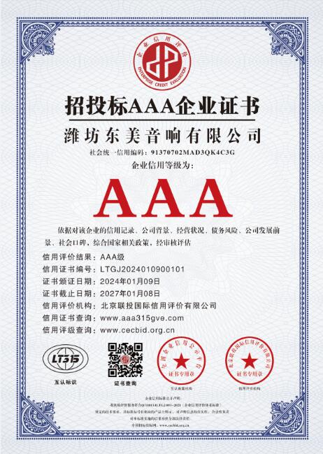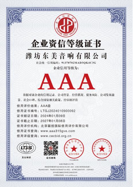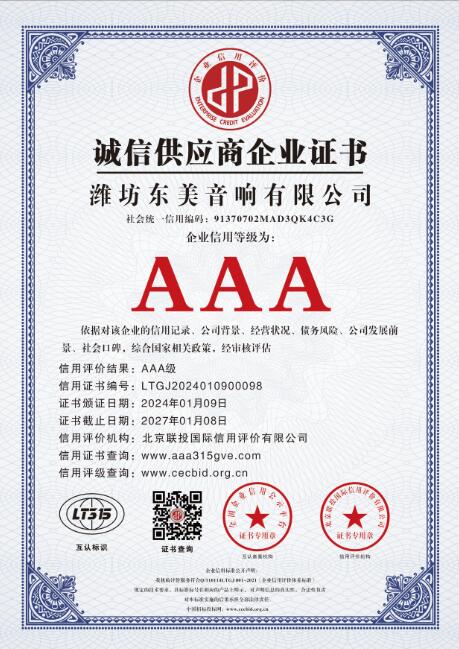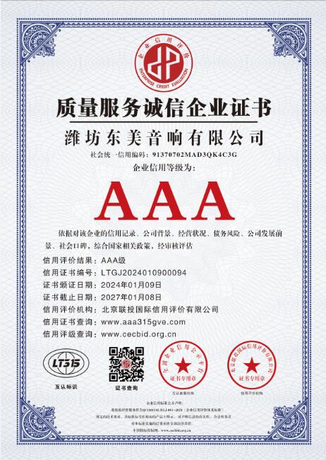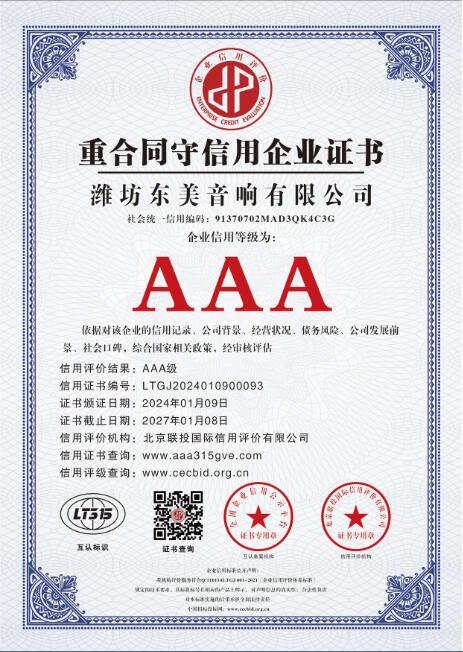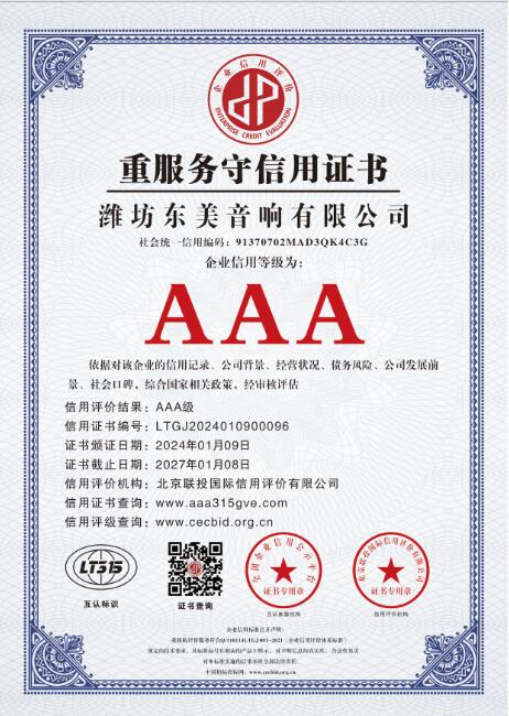 从公司成立年至今,东美音响荣获 “AAA级企业信用等级证书”,是音响行业权威机构对东美音响诚信经营、诚信履约、诚信品牌的充分肯定,也是公司又一次综合实力提升的表现。
