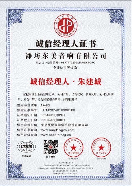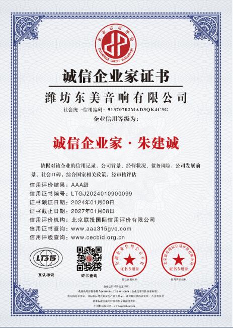 诚信是立企之本,兴业之道。在公司的发展历程中,东美音响高度重视信用建设,坚持诚信与使命同行,不断完善各项企业制度,在诚信建设、品牌建设、标准化建设等方面狠下功夫、强抓落实,着力打造规范经营、诚信为先的品牌形象,以专业化技术、高质量产品和一站式服务打造了信用交付体系,赢得了市场和客户的一致肯定。展望未来,东美音响将继续以诚信为基石,以质量为根本,以创新促发展,积极承担社会责任,树立良好信誉口碑,发挥好诚信企业的示范引领作用,争做行业信用体系建设的践行者,共同促进音响行业信用体系建设高质量发展!